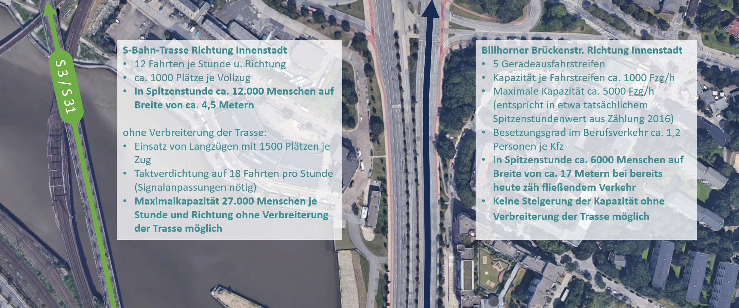 Das im Bild dargestellte Beispiel der Hamburger Norderelbbrücken zeigt es. Die S-Bahn schafft auf einem Bruchteil der Breite ein Vielfaches an Personen in die Stadt. Bei derzeit überwiegend eingesetzten Vollzügen mit etwa 1000 Plätzen je Zug schafft die S-Bahn bei in der Spitzenstunde annähernd vollausgelasteten 12 Zügen je Stunde ca. 12.000 Menschen auf einer Breite von etwa 4,5 Metern. Demgegenüber können in der morgendlichen Spitzenstunde auf den etwa 17 Meter breiten 5 Geradeausfahrstreifen der Billhorner Brückenstraße laut Verkehrszählung von 2016 etwa 5000 Fahrzeuge Richtung Innenstadt fahren. Das sind bei 1,2 Personen je PKW im Berufsverkehr etwa 6000 Menschen im bereits heute zäh fließendem Verkehr stadteinwärts.
