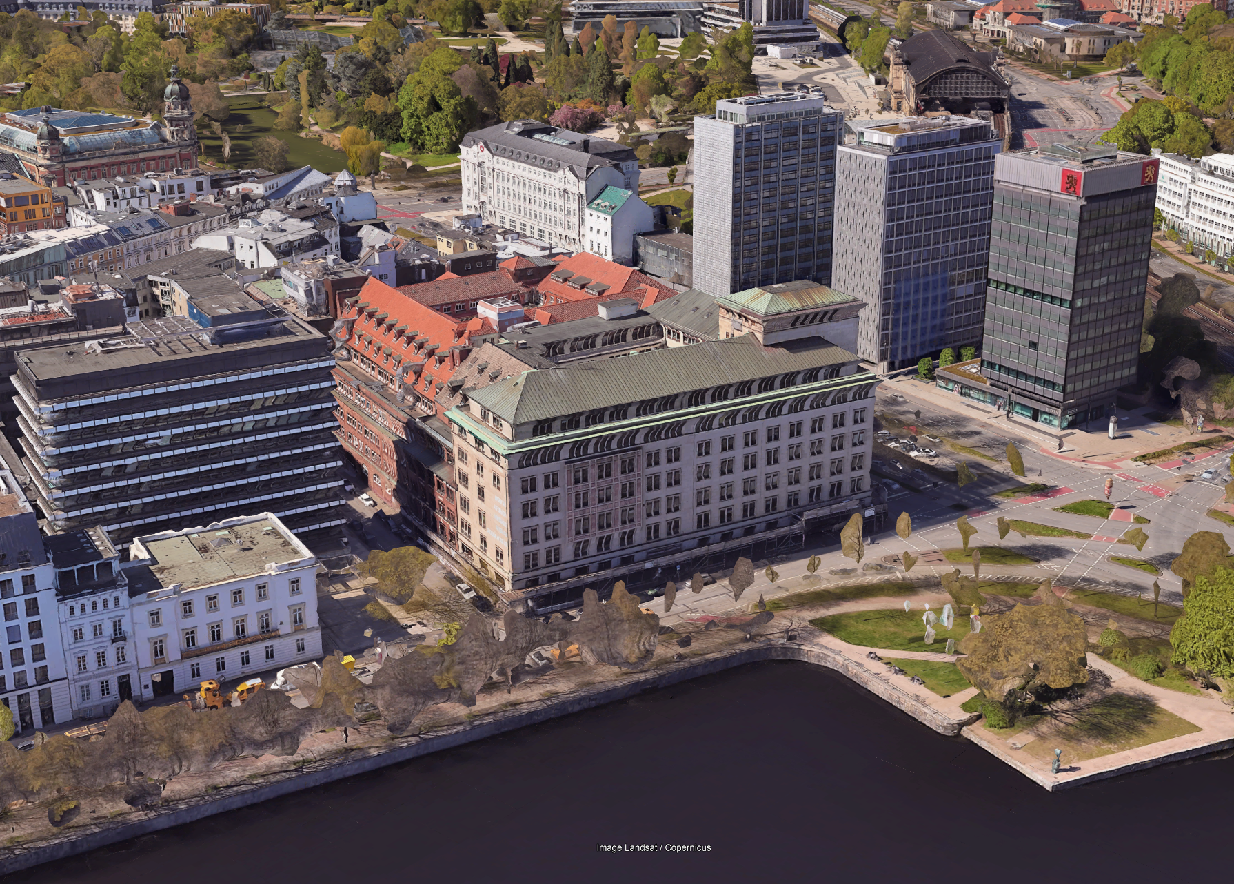 Das nordwestliche Ufer der Binnenalster mit der Esplanade im Hintergrund ist im Luftbildvergleich auch heute noch problemlos wiederzuerkennen. Die Kriegsschäden waren hier sehr gering. Änderungen sind aber auch hier nicht zu übersehen.